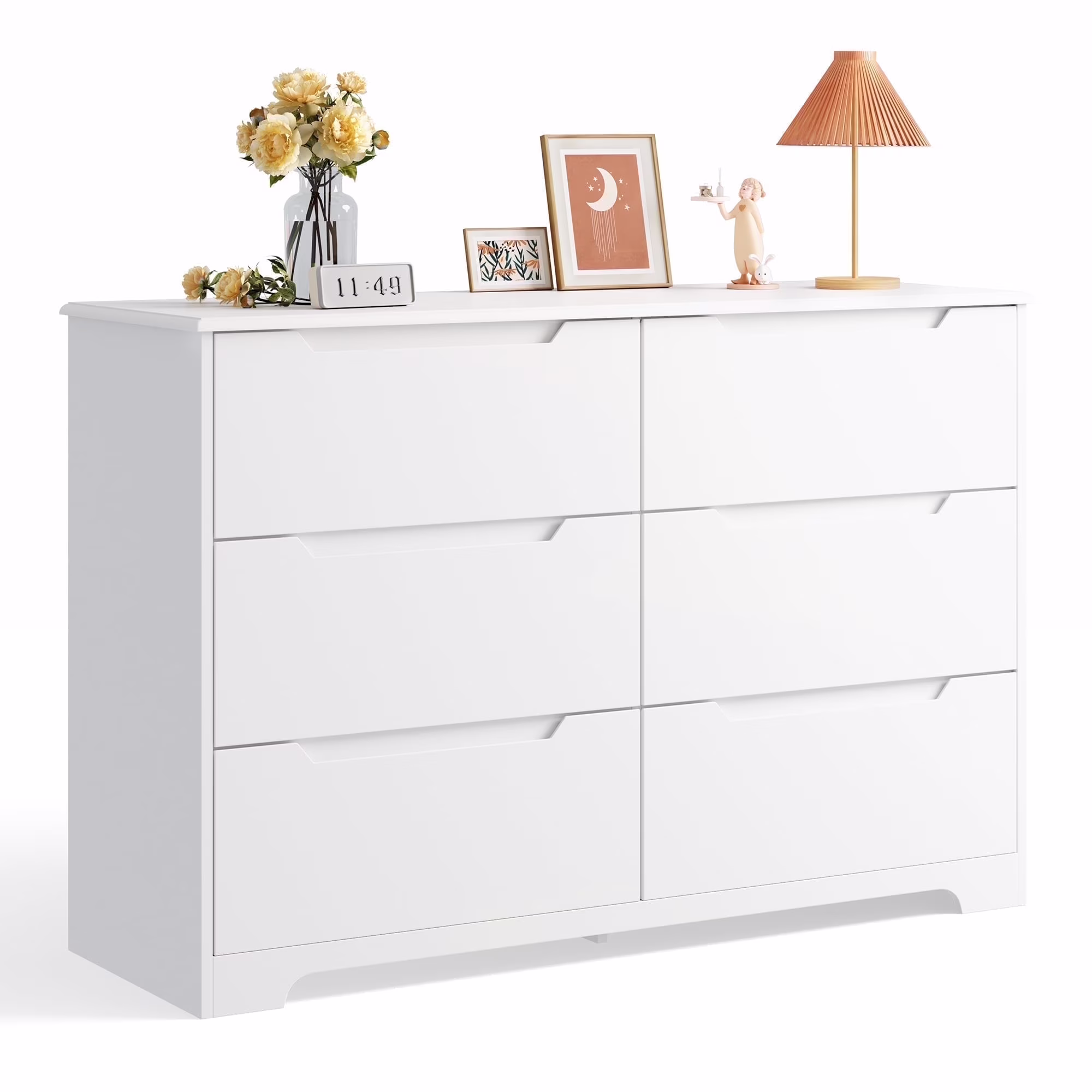 Dresser for Bedroom, Lofka 6 Drawer Double Dresser with Cutout Handles, Large Storage Capacity, Anti-Tip Safety, Modern Wood Chest of Drawers, Smooth Metal Rail, White