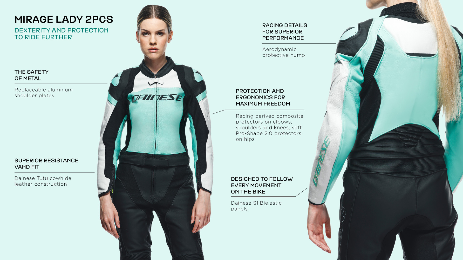 DetailWomen's Dainese Mirage two-piece motorcycle suit made with premium Tutu cowhide and ergonomically designed to best suit a woman’s body. Suitable for sport use. it is specifically optimized for road riding.